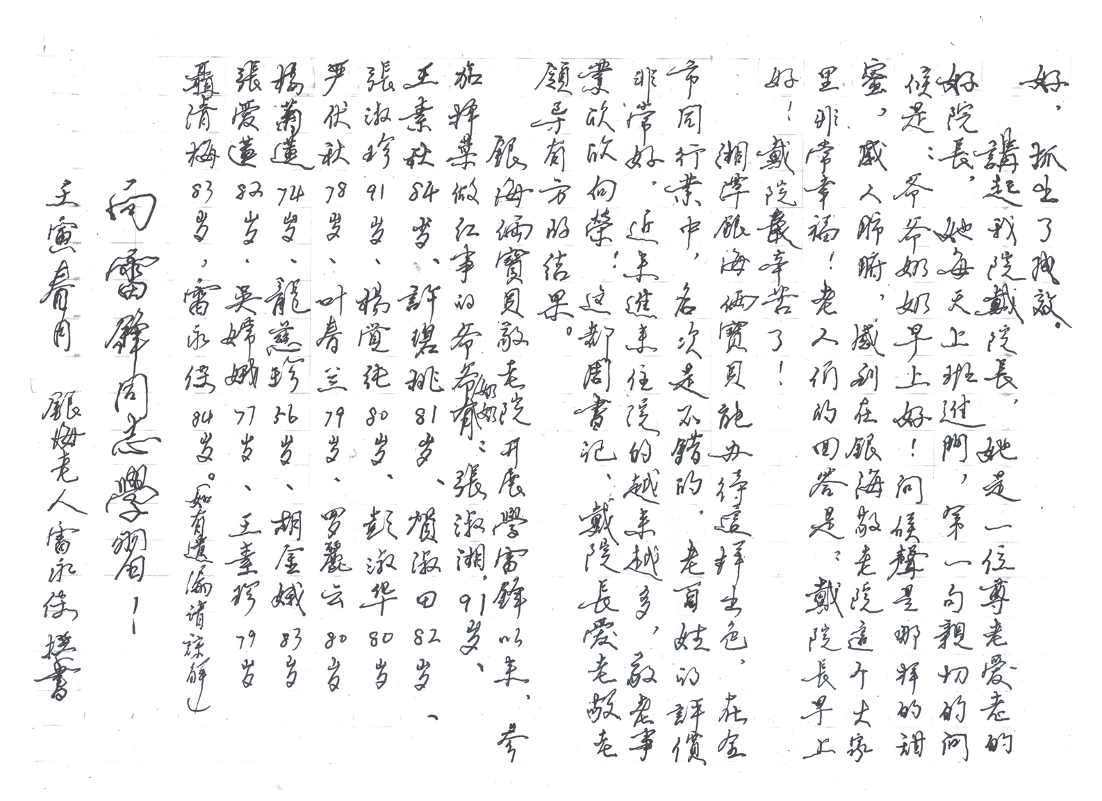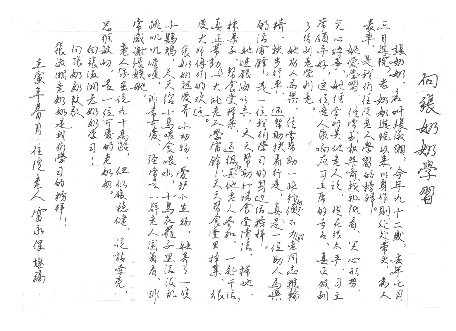 張奶奶,名叫張淑湘,今年九十二歲,去年七月三日進院,老奶奶進院以來,以身作則,處處帶頭,為人表率,是我們住院老人學習的榜樣。