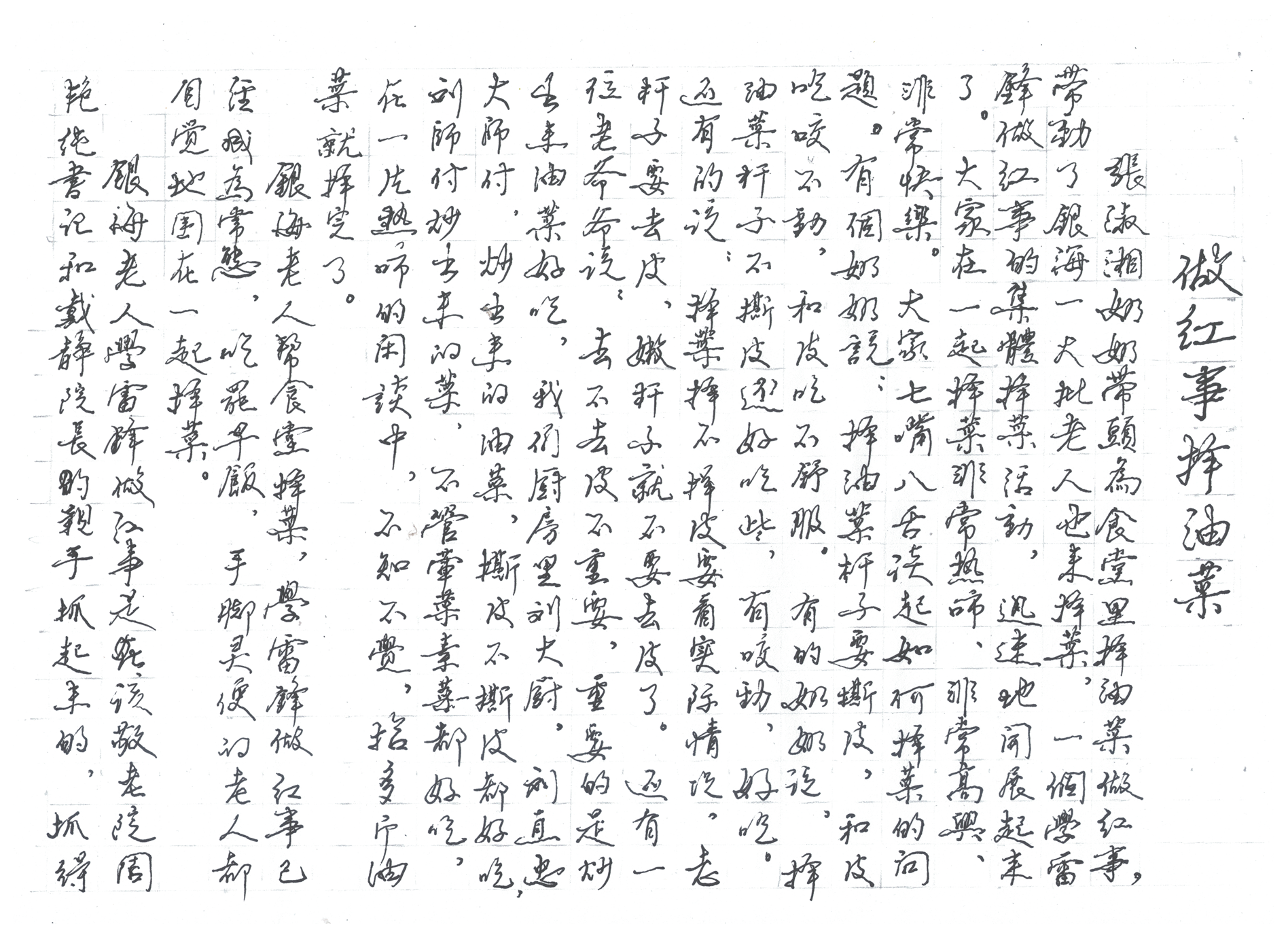 張淑湘奶奶帶頭為食堂里擇油菜做紅事,帶動了銀海一大批老人也來擇菜,一個學雷鋒做紅事的集體擇菜活動,迅速的開展起來了。大家在一起擇菜非常熱鬧、非常高興、非常快樂。大家七嘴八舌談起如何擇菜的問題。有個奶奶說:擇油菜桿子要撕皮,和皮吃咬不動,和皮吃不舒服。有的奶奶說:擇油菜桿子不撕皮還好吃些,有嚼勁,好吃。還有的說:擇菜,擇不擇皮要看實際情況,老桿子要去皮,嫩桿子就不要去皮了。還有一位老爺爺說:去不去皮不重要,重要的是炒出來油菜好吃。我們廚房里劉大廚,炒出來的油菜,撕皮不撕皮都好吃,劉師傅炒出來的菜,不管葷菜素菜都好吃。在一片熱鬧的閑談中,不知不覺,拾多斤油菜就擇完了。