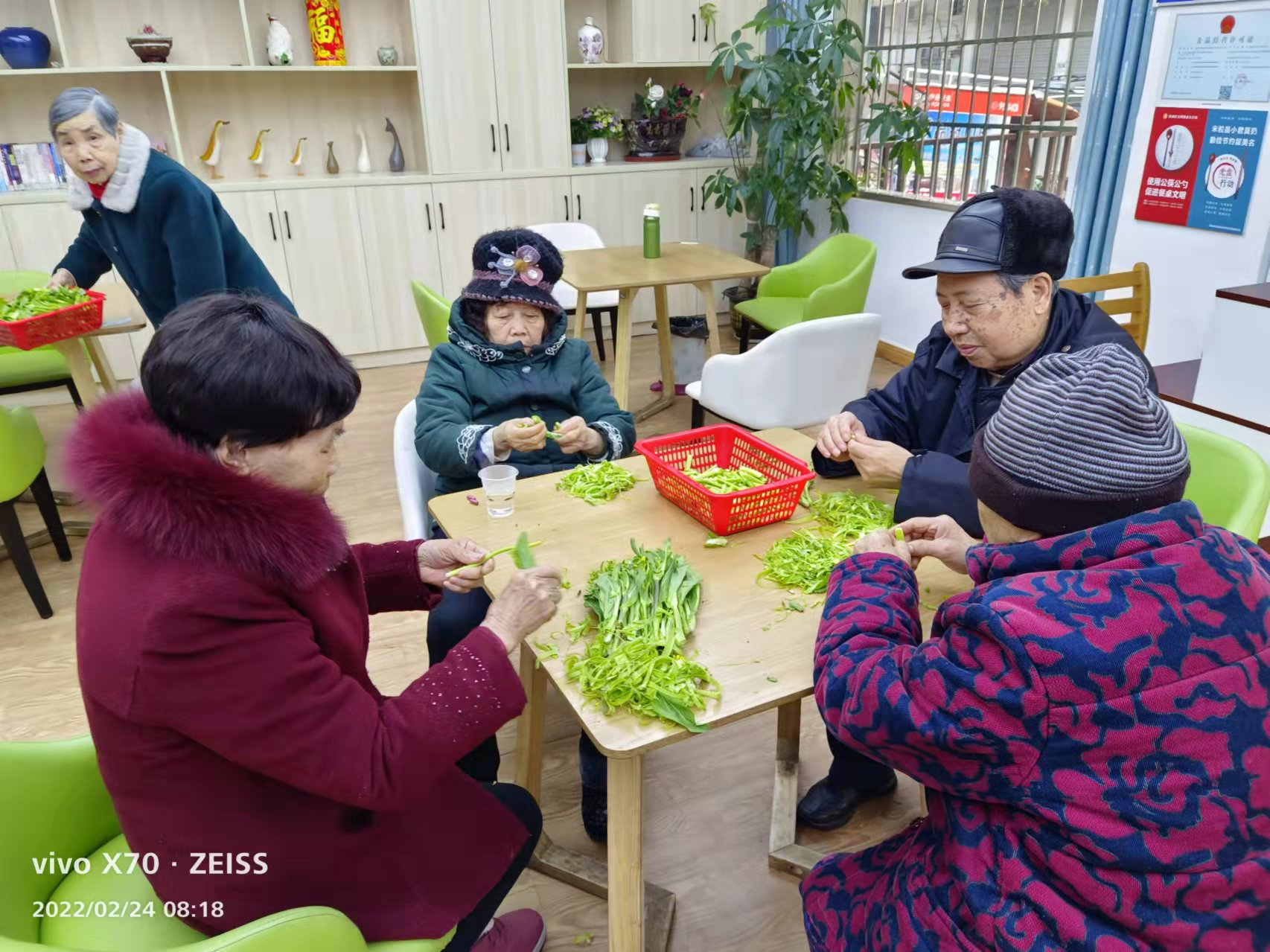 銀海老人幫食堂擇菜,學雷鋒做紅事已經(jīng)成為常態(tài),吃罷早飯,手腳靈便的老人都自覺的圍在一起擇菜。