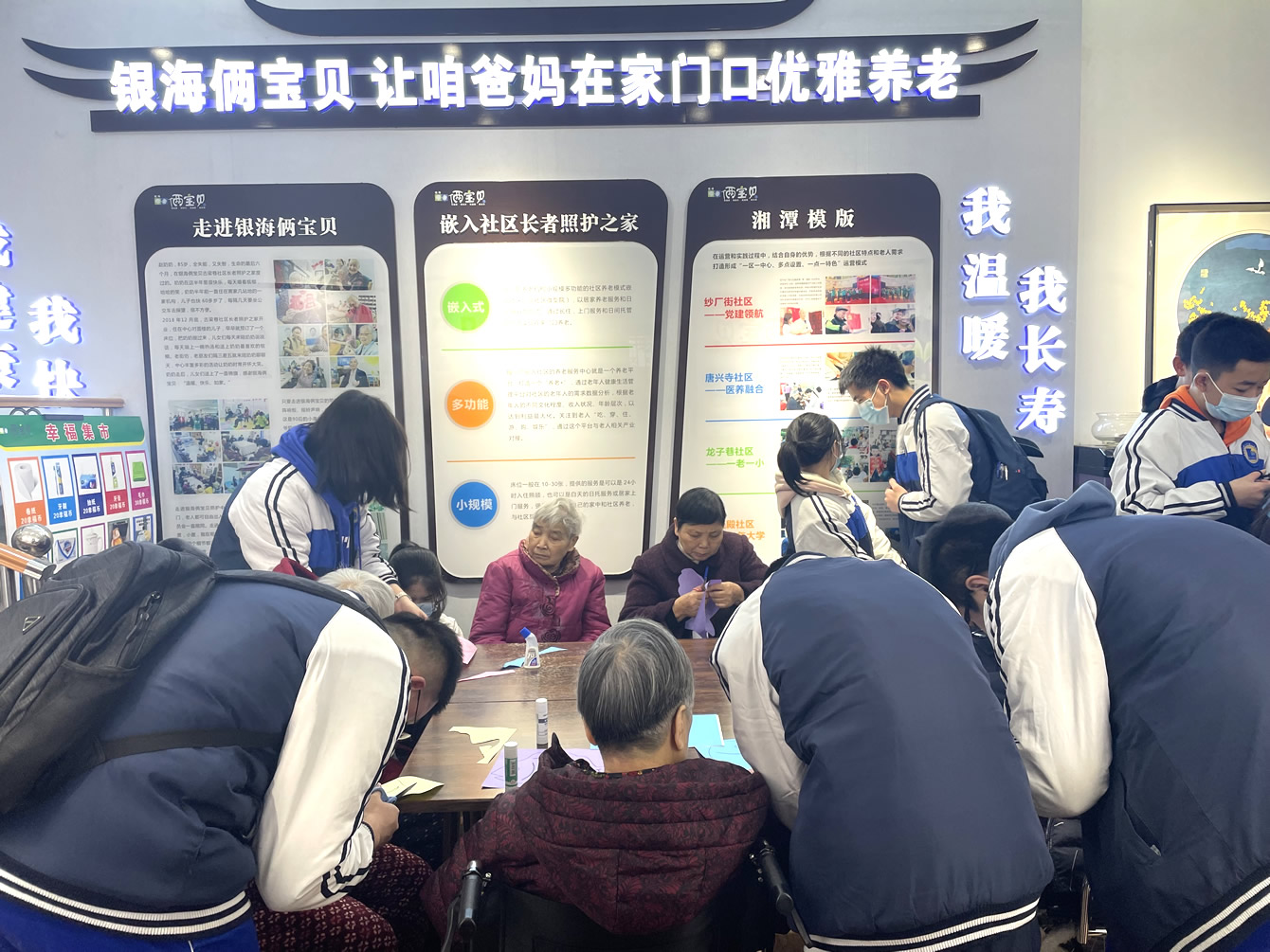 伴隨著激昂的音樂、一陣陣鏗鏘有力的歌聲從銀海倆寶貝窯灣康養(yǎng)中心傳出,白發(fā)蒼蒼的“80后、90后”與青春正好的“00后”開啟了一段奇妙的碰撞。