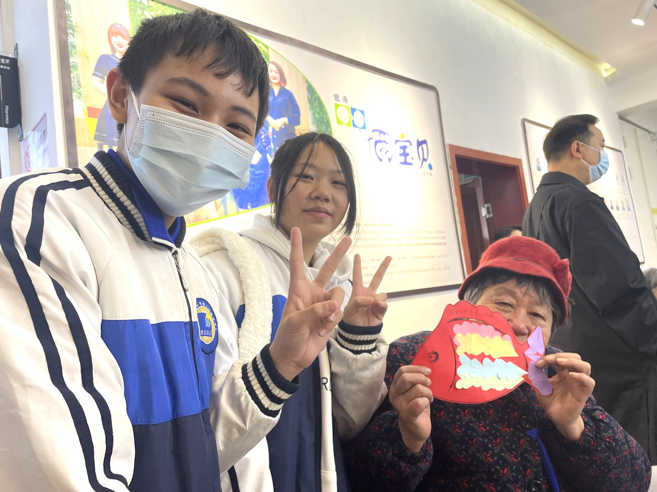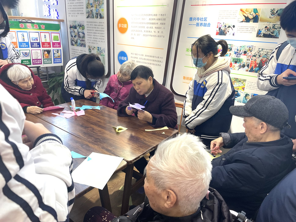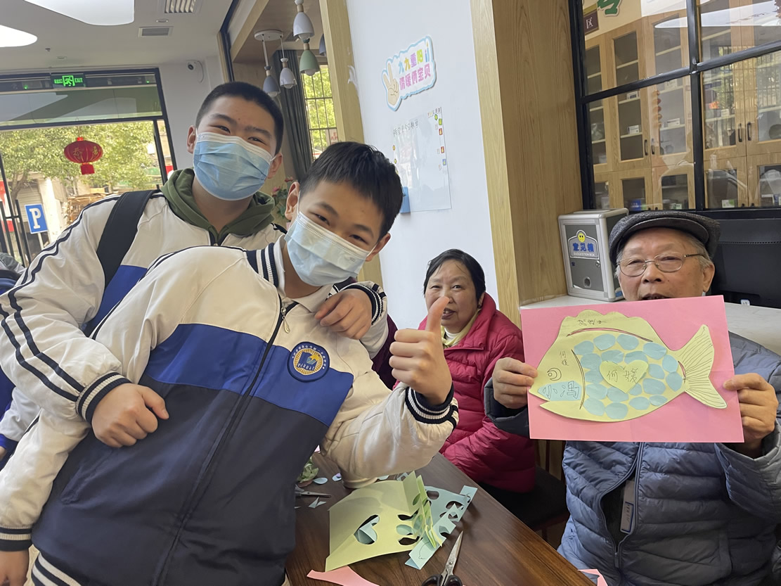 “爺爺,您喜歡這個顏色是嗎?下面我?guī)椭黄鸢阉舫鰜砗脝??”、“奶奶,您平常都有些什么愛好呀,可以跟我們說說您的故事嗎?”……只見同學們有的蹲坐在老人旁邊,有的則是伏耳于他們面前,耐心認真地和爺爺奶奶們進行交流,其他的人則是分工協(xié)作,完成“魚”的其他部位制作。不多久,一條條色彩斑斕,創(chuàng)意十足的“魚”就做好啦!爺爺奶奶們拿著完成的作品分別和自己的“小伙伴”們合影留念,再次感謝他們的到來!