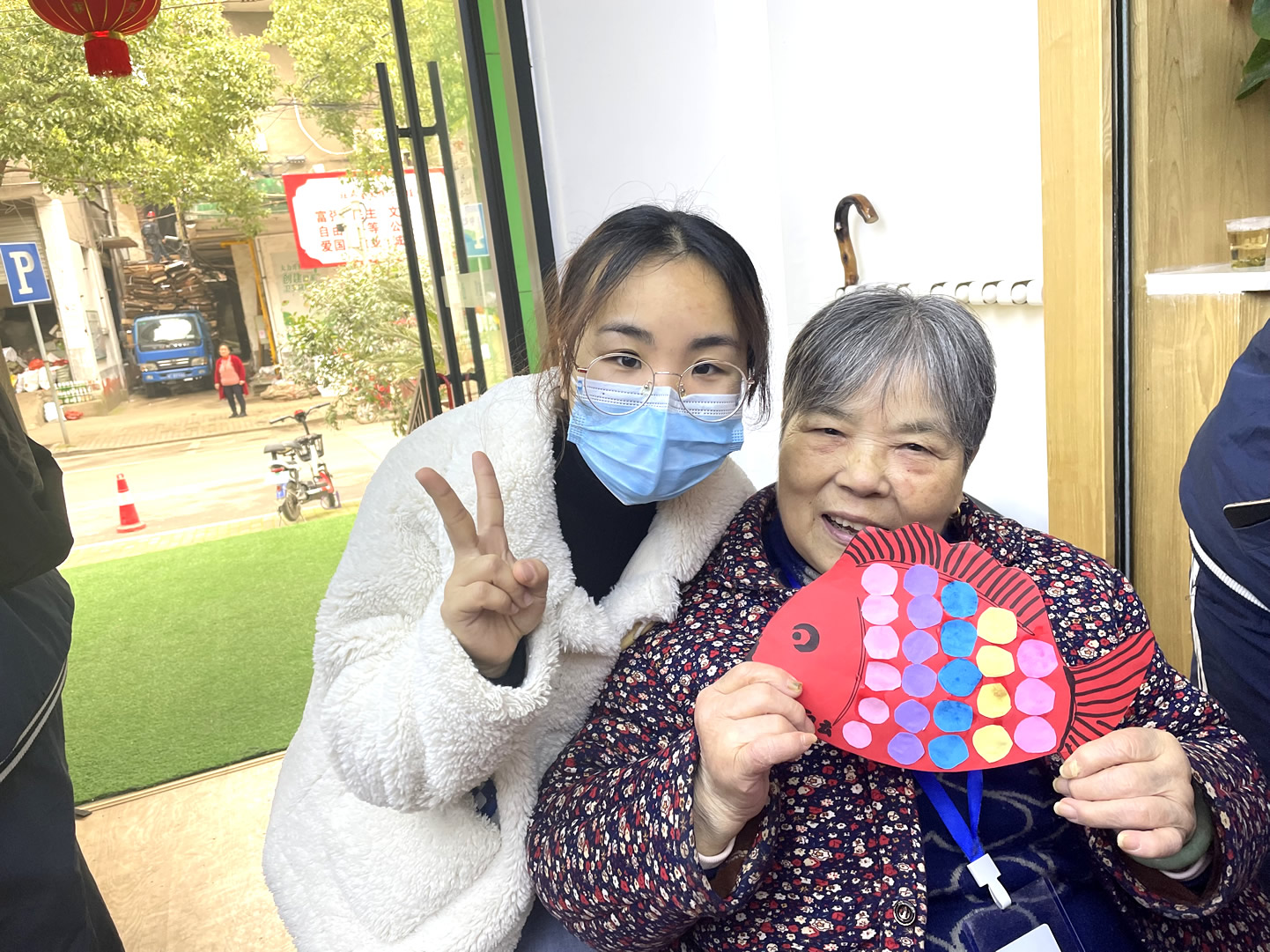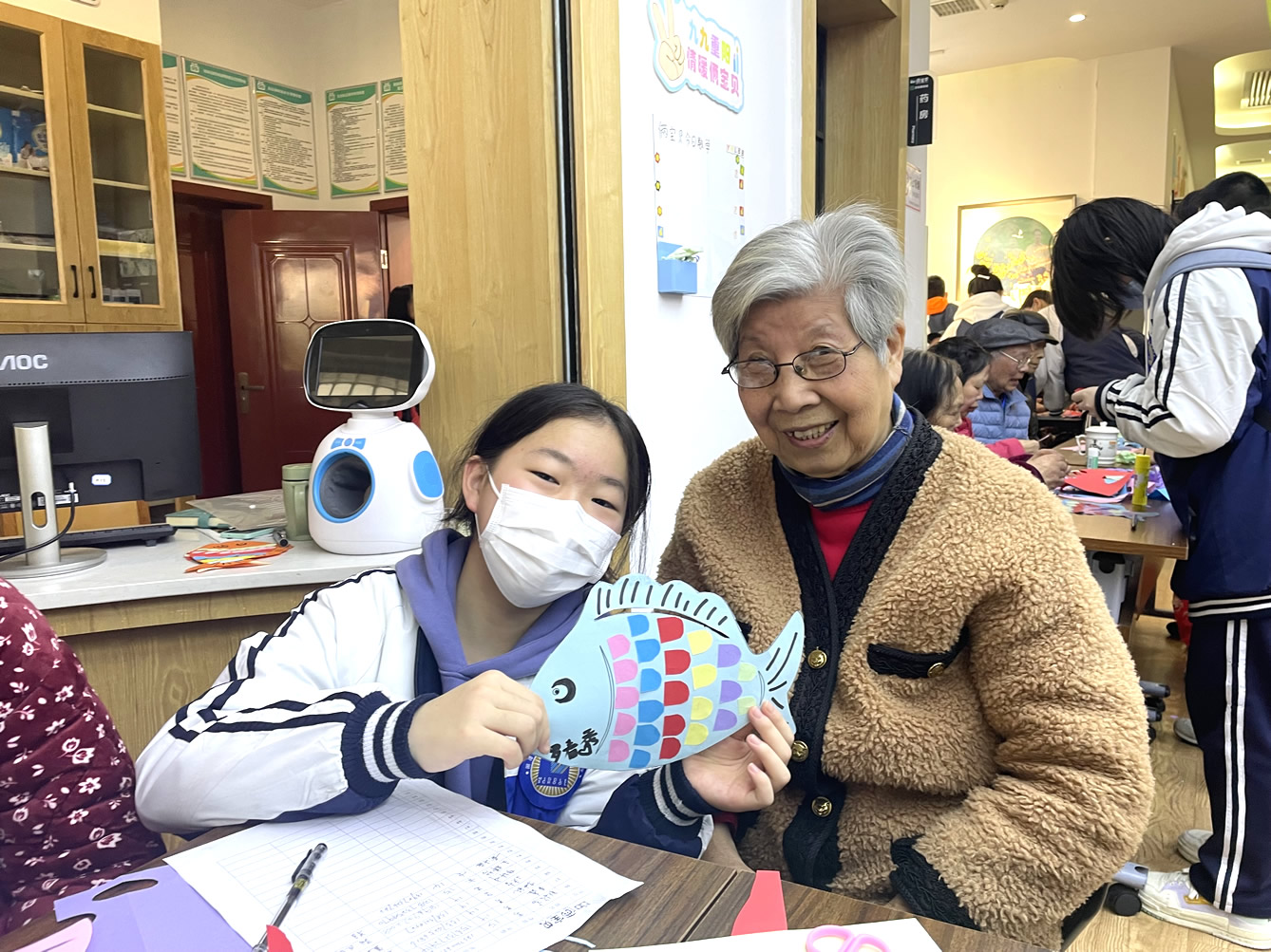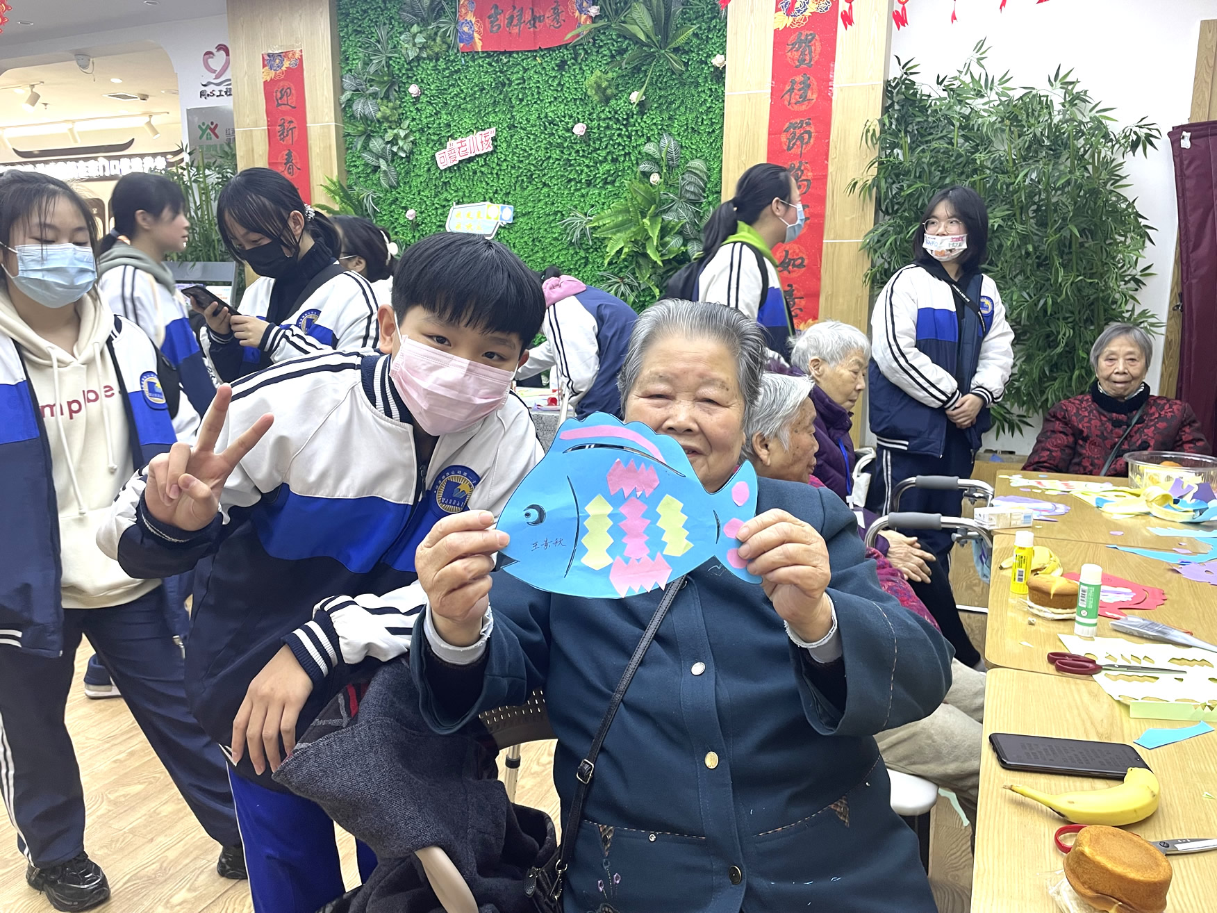 “爺爺奶奶們好!”還未瞧見人一聲聲清脆響亮的問好聲便已傳了進來,在老師及工作人員的組織下同學們有序進入到院內(nèi)并配合做好疫情防控登記。不一會兒,同學們陸續(xù)找到爺爺奶奶進行自我介紹,并以一對一的形式來協(xié)助他們完成今天的手工作品“年年有魚”。