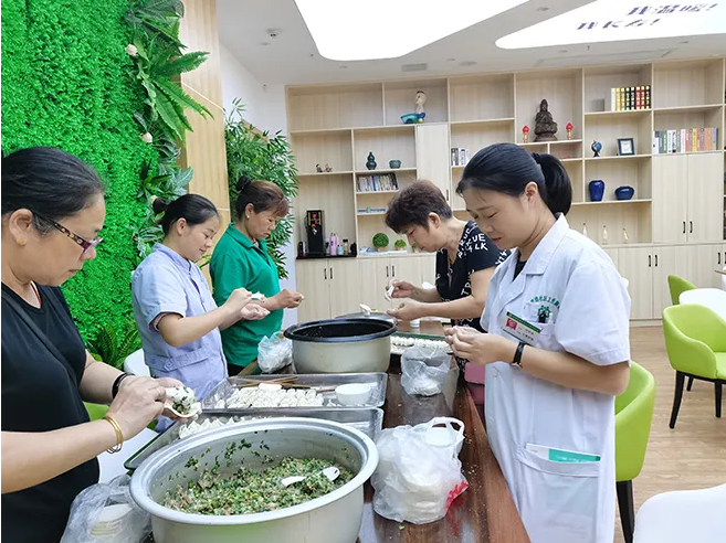 烈日當頭,也阻擋不住大家的熱情,窯灣街道社區(qū)衛(wèi)生服務中心的阿姨們早早地來到了倆寶貝窯灣康養(yǎng)中心,開始有條不紊的包餃子。